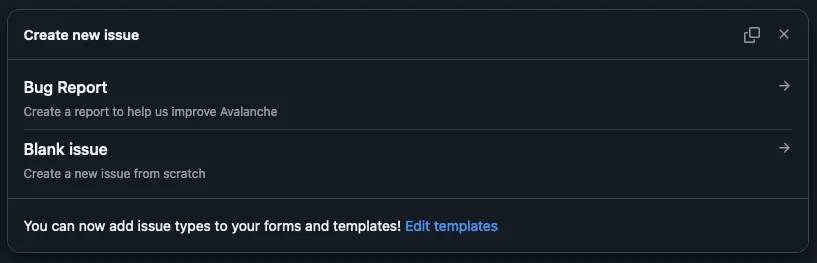 README.mdwith a link to create new issues using your template:README.md Please read our [Code of Conduct](CODE_OF_CONDUCT.md) before participating in the community.## Bugs and Feature RequestsHave a bug or a feature request? Please first search for existing and closed issues. If your problem or idea is not addressed yet, [please open a new issue](https://github.com/Open-reSource/avalanche/issues/new/choose).## License
