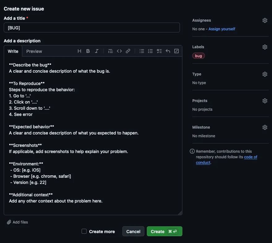 Providing an issue template improves the clarity and completeness of bug reports. A well-defined bug report saves time, minimizes confusion, and helps maintainers address problems faster. Follow the steps below to create a Markdown-based template for bug reports.