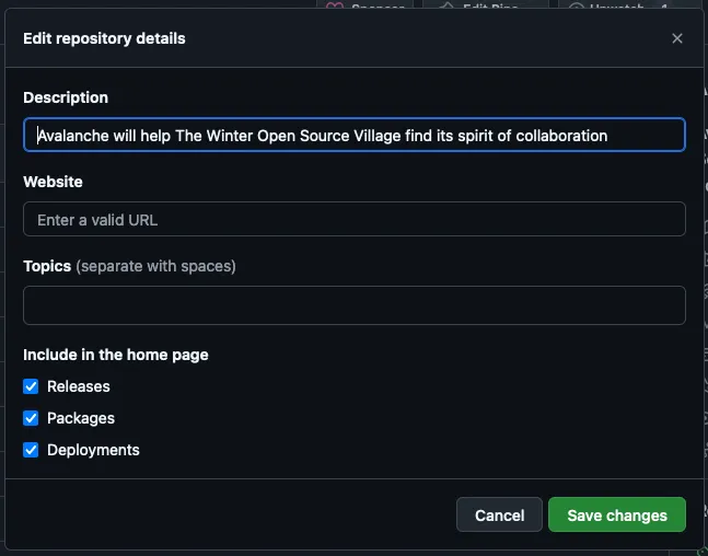 Navigate to your repository, and on the right side, in the About section, click the edit button. A popup will open where you can update the following: